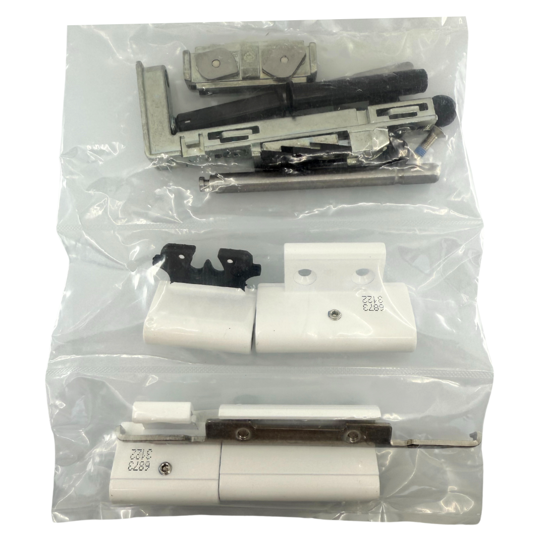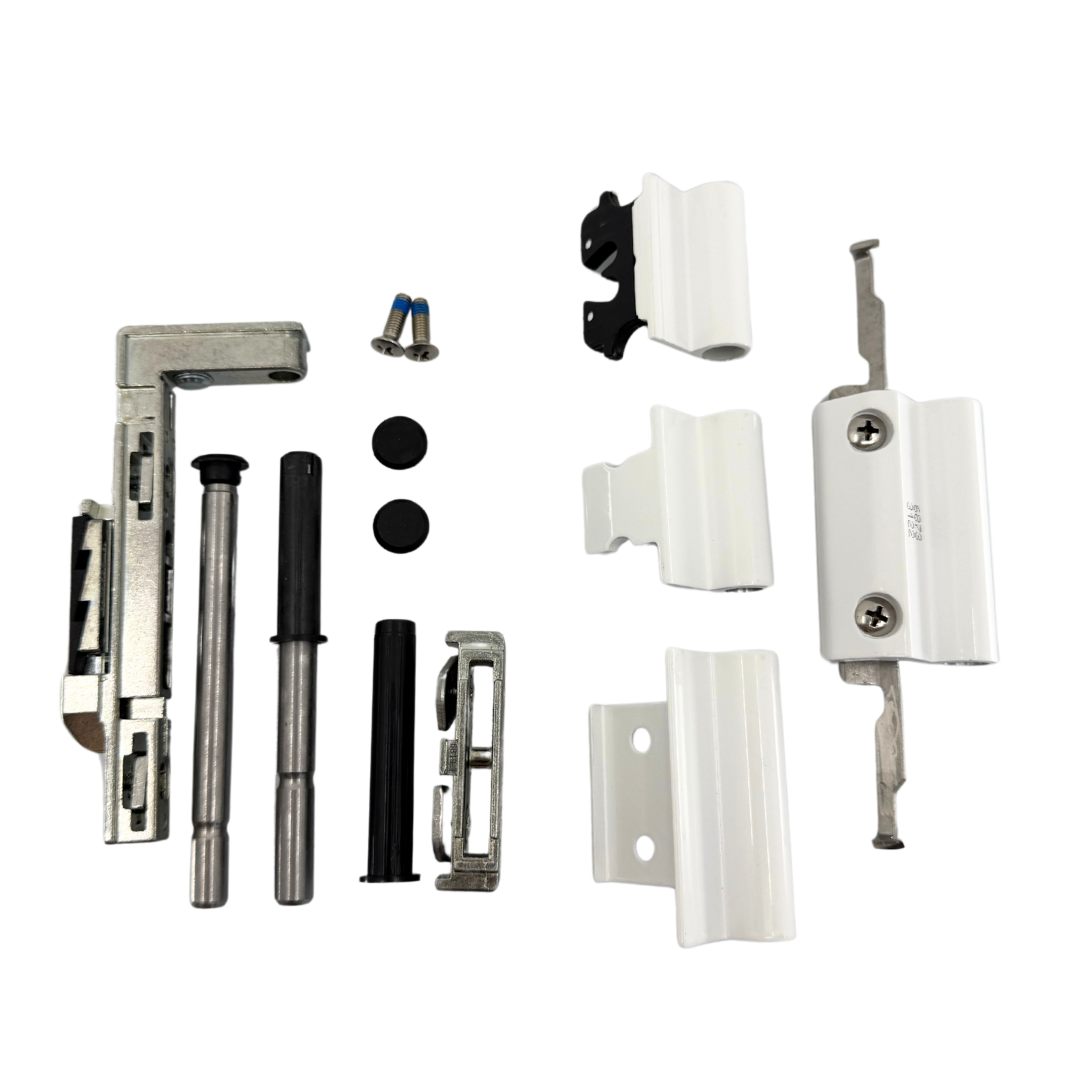 Plná sada spodního ložiska s nosným dílem a bílými krytkami pro plastová okna a balkonové dveře se systémem kování G-U. Ideální sada pro kompletní výměnu spodního pantového ložiska včetně uchycení a zakrytování.